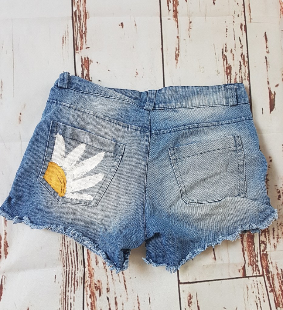 Pantaloncini corti in denim👖con una raggiante margherita🌼 sulla tasca posteriore